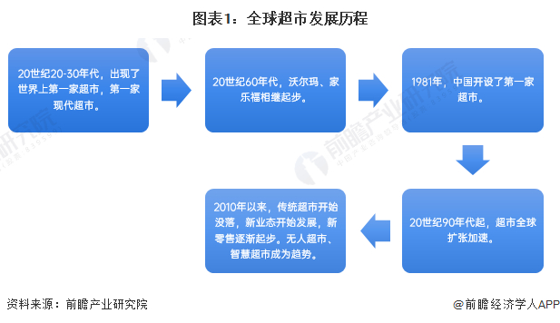 超市业态最早出现在美国,1919年美国人桑德斯开设了第一家自助商店。1930年,第一家现代超市诞生,随后超市这种业态就在全世界开始盛行。全球零售业巨头沃尔玛在1962年开出第一家超市,1963年法国超市巨头家乐福从一家平价超市起步,经过多年发展两家企业逐渐成为行业龙头。1981年中国开设了第一家超市,随后超市逐渐在中国遍地开花。20世纪90年代起,外资开始在全球跑马圈地,包括在中国这个广阔的市场中扩张。2010年以来,随着电商发展,传统超市开始衰落,线上线下新零售格局开始建立,生鲜超市等新业态开始出现。在人工智能、物联网等新技术的赋能下,无人超市、智慧超市等逐渐进入消费者视野。