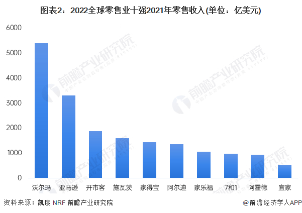 根据凯度和NRF(美国国家零售联盟)发布的2022年全球零售商10强排名。报告显示,排名全球前十的零售商分别是:沃尔玛、亚马逊、开市客、施瓦茨集团、家得宝、阿尔迪、家乐福、阿霍德、宜家。其中家乐福以5382亿美元的零售收入排名第一,远超第二名亚马逊。