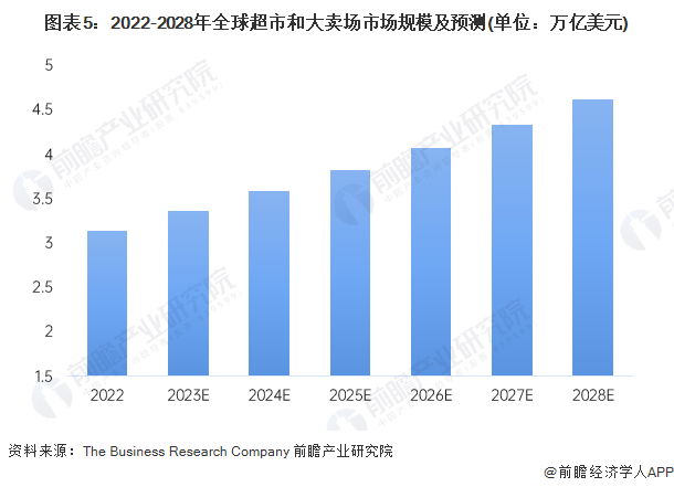 根据The Business Research Company报告,2022年全球超市和大卖场市场规模约为3.14万亿美元,预计2023年将增长至3.37万亿美元,此后将以6.5%的年复合增长率增长,则到2028年,全球超市和大卖场市场规模约为4.62万亿美元。