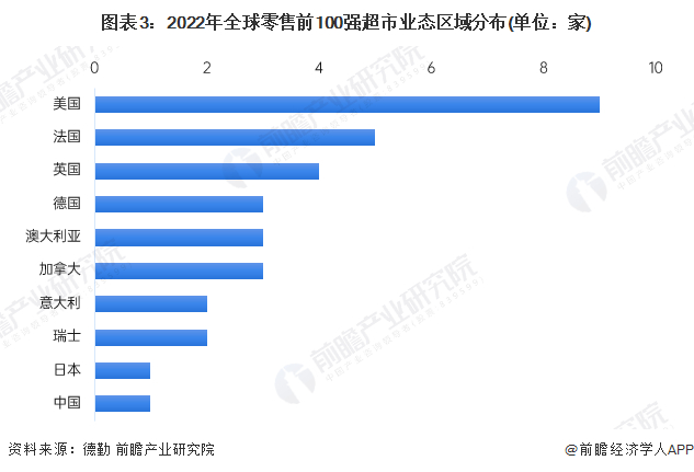 从区域竞争来看,根据德勤发布的《2022全球零售力量》报告,全球零售前100强超市主要分布于美国、法国、英国等国家,其中美国有9家超市在全球零售100强内榜上有名,而法国有5家、英国有4家。德国、澳大利亚、加拿大也分别有3家。