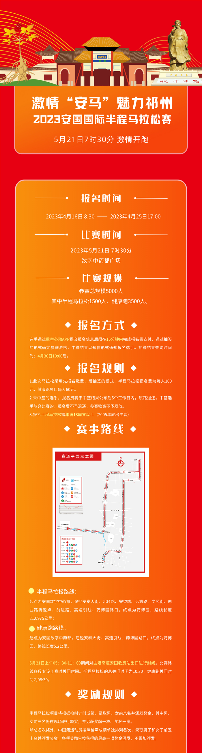 2023“安马”将于5月21日07:30发令开跑,设置半程马拉松、健康跑两个项目,参赛总规模为5000人。其中,半程马拉松1500人、健康跑3500人。