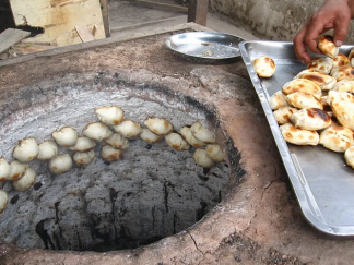 馕坑烧烤的主角当然少不了烤包子、烤馕、烤库麦琪(相当于羊肉馅的馕)以及烤全羊。用胡杨木当炭火,把食材放入馕坑,接下来就是安静地等待。新疆烤全羊的精髓就在放入馕坑前涂抹的一层黄色酱料,除了盐等普通调料,鸡蛋液也必不可少。