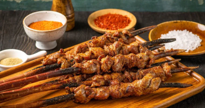 与烤羊肝能一决高下的还有红柳烤肉。红柳树就地取材,果木香气、羊肉香气、炭火香气三合一,一面辣椒一面孜然,颗颗肉粒饱满、外焦里嫩。