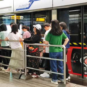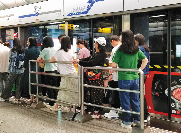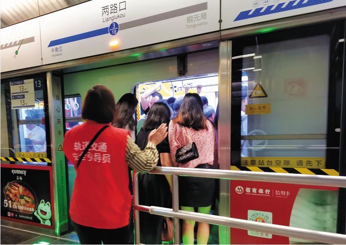 记者注意到,早高峰时段,3号线最小行车间隔只有2分半钟,乘客挤不上车也不会硬挤,而是退回来等下一班车。在两路口站,50岁的马女士说:“我经常坐3号线出行,还没有看见过推背服务呢。”