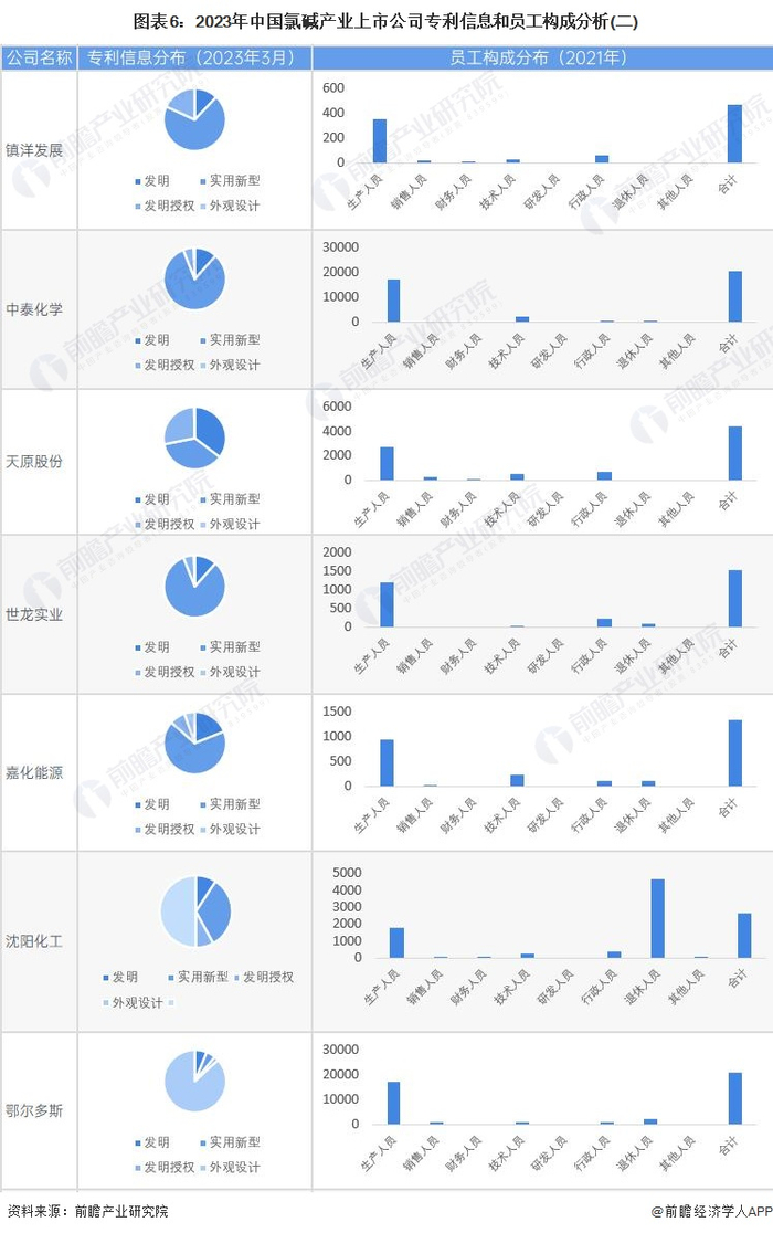 从氯碱行业的上市企业已有的公开信息分析,专利信息相对较多的企业是中泰化学(002092.SZ),其中发明专利101条;员工总数最多的是鄂尔多斯(600295.SH),员工总数为21055人。