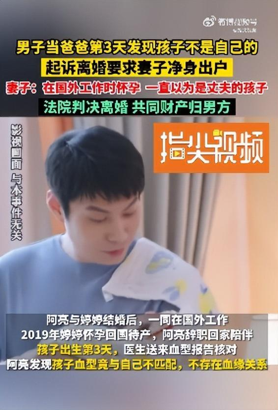 5月11日,据水母网“指尖视频”报道,近日,在河南郑州,男子当爹三天发现孩子不是自己的,随即起诉离婚,要求妻子净身出户,法院判决离婚,共同财产归男方。