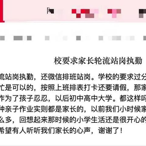 该消息称,上述学校还微信排班站岗。投诉内容认为学校的要求过分了,“学生在校期间归学校管,如果有需要偶尔去帮忙是可以的,按照上班一样排表打卡,那家长怎么工作生活?”