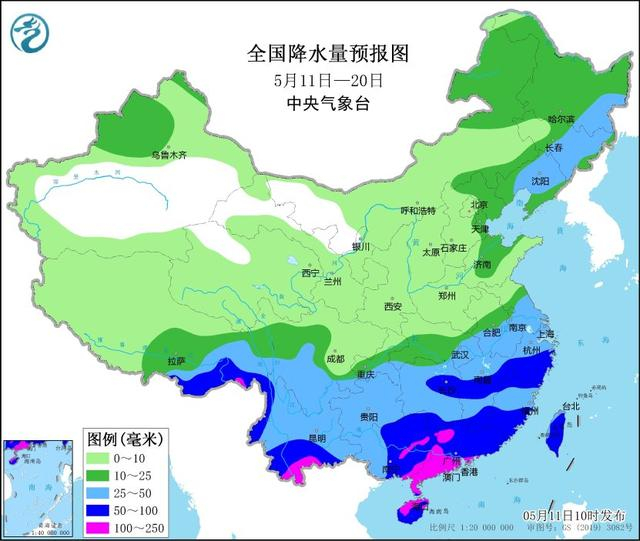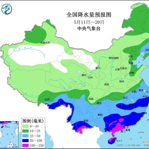 未来11-14天(5月21-24日),主要降雨区位于江南南部、华南中北部及四川东部、重庆、贵州等地,大部地区累计降水量有20~40毫米,局部地区有60~80毫米。