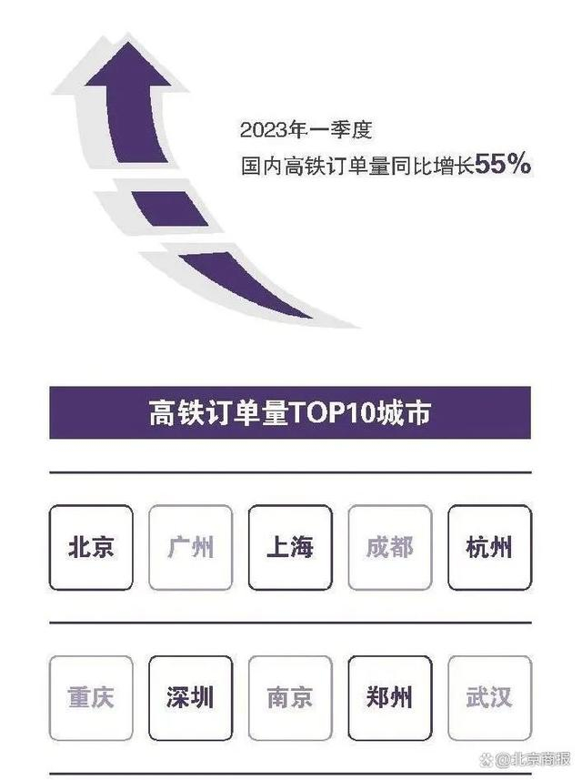 深蓝智库梳理OTA的数据发现,2023年一季度,国内高铁订单量同比增长55%;订单量TOP10目的地城市分别是北京、广州、上海、成都、杭州、重庆、深圳、南京、郑州、武汉,主要集中在商旅市场较为大的城市。其中,北京以一季度高铁订单量同比增长122%高居榜首。