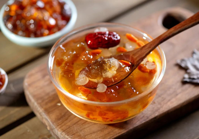 金耳和银耳含有丰富的多糖,导致它们看上去是半透明的凝胶状,干了以后再泡发,这种质感也会随之恢复。当我们煮金耳或者银耳时,多糖类溶解到水中形成胶状,带来了黏糊糊的口感。