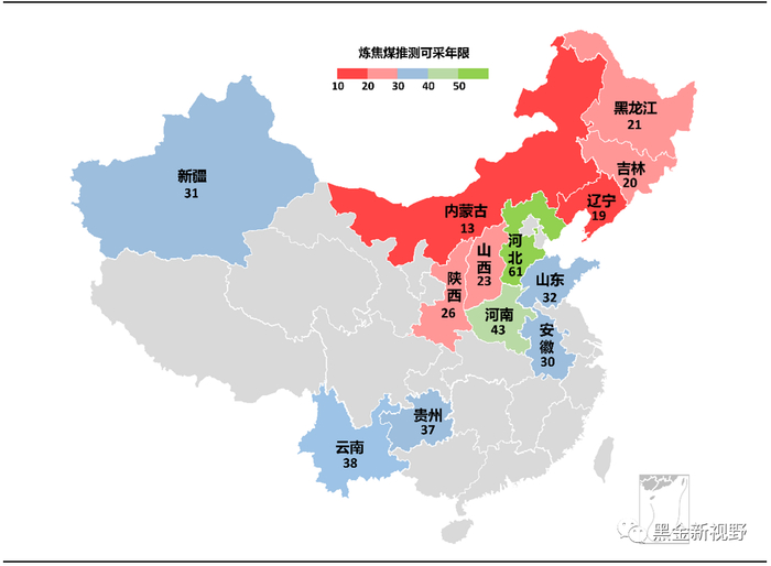 图8:我国部分省份炼焦煤资源推测可采年限分布(年)