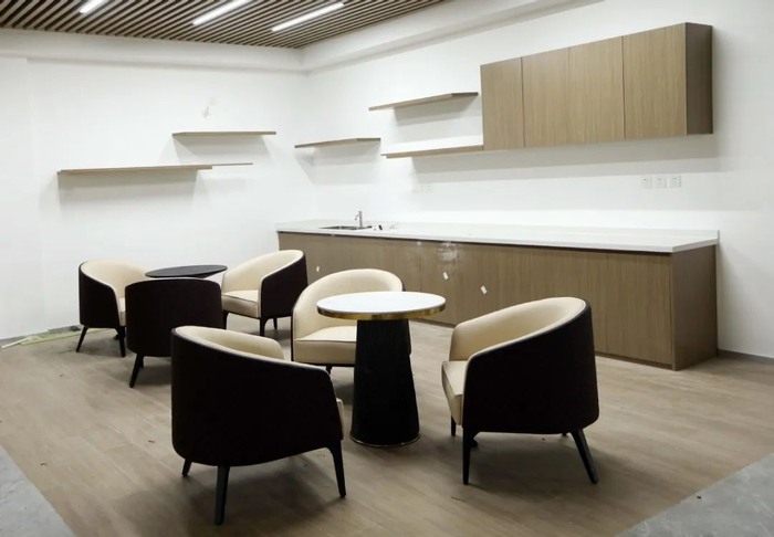目前,在“壹栋”办公区域,会议室、办公室、茶水间等已完工,施工人员正在进行最后的装修收尾阶段。而在室外,各类绿植搭配组合搭建起一个街心公园,为市民提供了一个放松身心的城市“绿洲”。