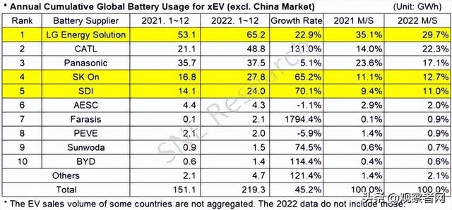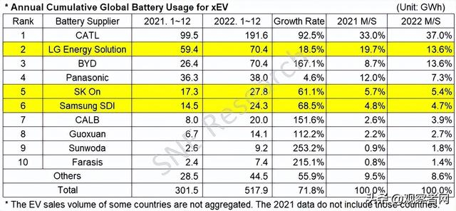 根据韩国电池市场研究机构SNE Research的数据,2022年,宁德时代装机量为191.6GWh,同比增长92.5%,市场份额达到37%,比上年增加4.0个百分点,份额接近第二名LG(13.6%)的三倍。