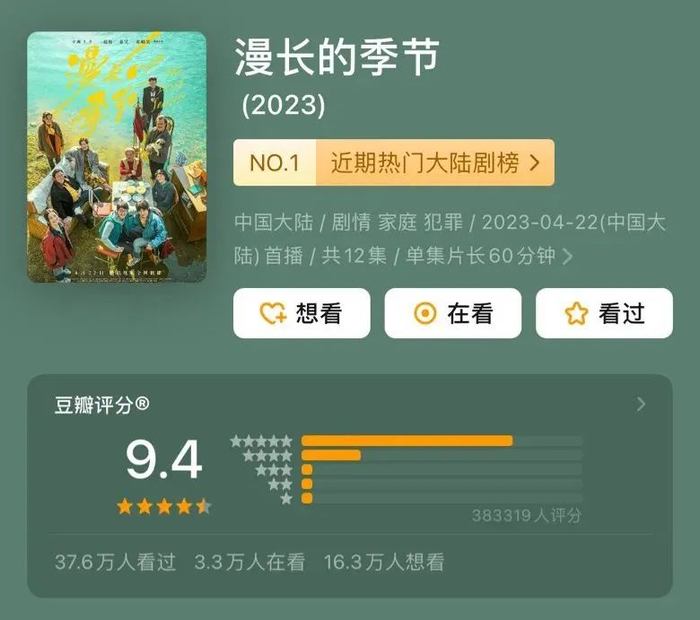 五一档的影视剧市场,最火的莫过于由辛爽执导,范伟、秦昊、陈明昊领衔主演的《漫长的季节》。自4月22日甫一上线,就在豆瓣得到9.0的高分,随着剧情推进,分数越来越高,5月1日大结局之后,更是冲上不可思议的9.4分,远超春节档的热播电视剧《狂飙》。