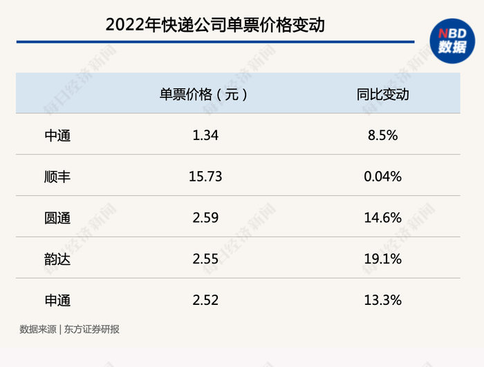 东方证券研报显示,过去一年快递公司单票收入呈现回升的态势。2022年月均单票收入顺丰(15.73元)>圆通(2.59元)>韵达(2.55元)>申通(2.52元)>中通(1.34元);单票收入增速韵达(19.1%)>圆通(14.6%)>申通(13.3%)>中通(8.5%)>顺丰(0.04%)。
