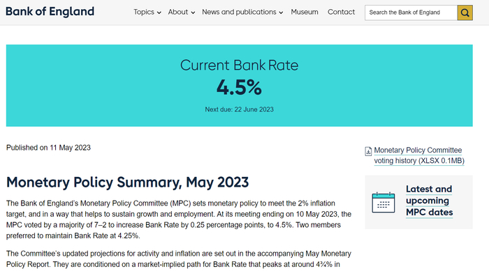 从2021年12月开始,英国央行已经连续加息12次。根据公告,英国央行的货币政策委员会以7-2的投票结果批准了这次的加息,这也与市场预期一致。两名投反对票的委员倾向于将利率维持在4.25%。