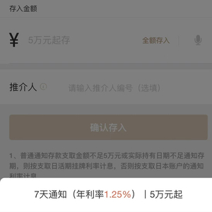 记者查询发现,国有大行1天、7天通知存款年利率大多分别为0.45%和1%,部分股份行的利率稍高,分别可达0.7%和1.25%,起存金额为5万元。