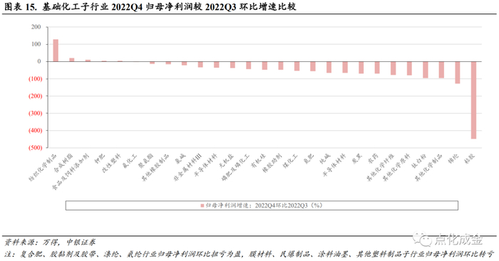 多数子行业22Q4归母净利润相比于22Q3环比下跌。22Q4有22个子行业的归母净利润相比于22Q3有所下滑,粘胶、锦纶子行业分别下跌448.67%、128.63%,复合肥、胶黏剂及胶带、涤纶、氨纶等4个子行业22Q4归母净利润相比于22Q3扭亏为盈,涂料油墨、民爆制品、其他塑料制品、膜材料4个子行业转亏。仅有5个子行业有不同程度的涨幅,其中纺织化学制品子行业涨幅达129.26%,其余4个子行业涨幅较小。