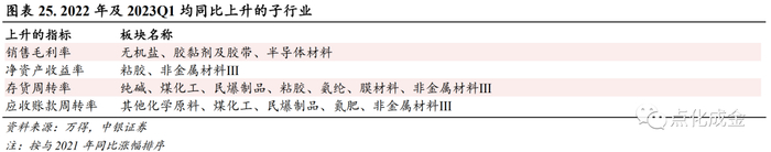 从毛利率角度,2022年与2023Q1同比均提升的子行业包括无机盐、胶黏剂及胶带、半导体材料。从ROE角度,2022年与2023Q1同比均提升的子行业包括粘胶、非金属材料。从存货周转率角度,2022年与2023Q1同比均提升的子行业包括纯碱、煤化工、民爆制品、粘胶、氨纶、膜材料、非金属材料III。从应收账款周转率角度,2022年与2023Q1同比均提升的子行业包括其他化学原料、煤化工、民爆制品、氮肥、非金属材料III。