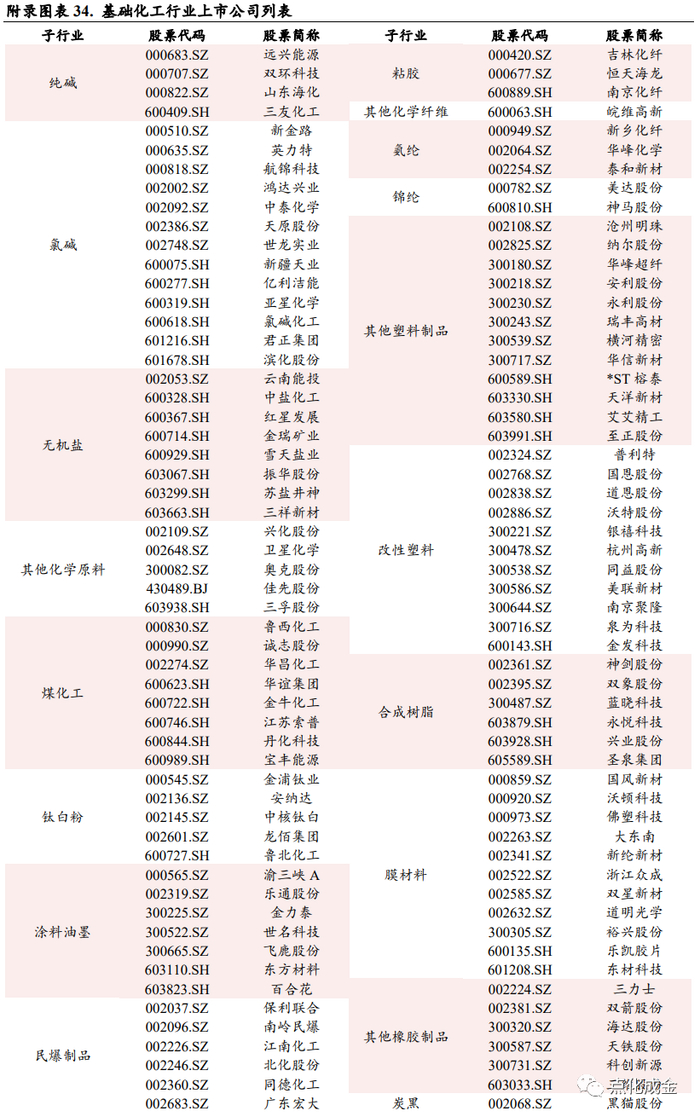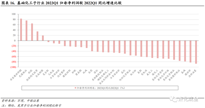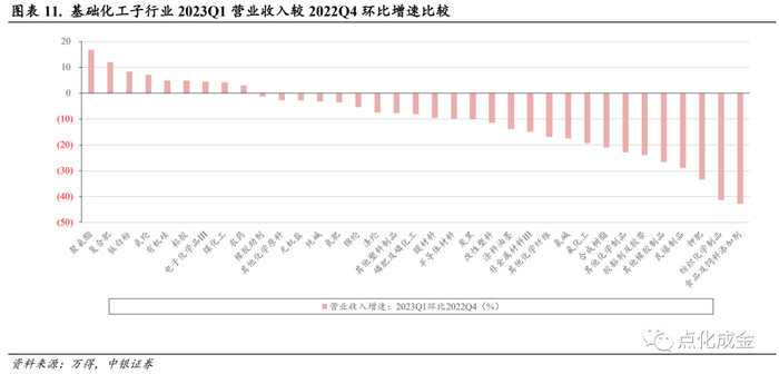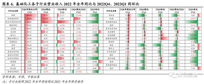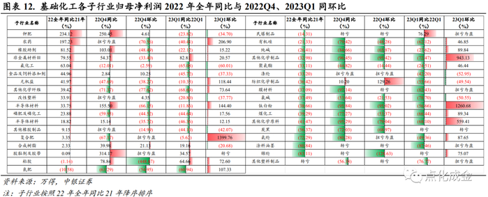 从收入角度,22Q4/23Q1环比持续增长的子行业包括钛白粉和复合肥;23Q1同环比均增长的子行业包括钛白粉和聚氨酯。从归母净利润角度,22Q4/23Q1环比持续增长的子行业包括氨纶、复合肥;23Q1同环比均增长的子行业包括民爆制品、粘胶以及非金属材料III。