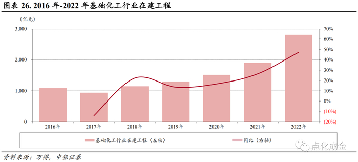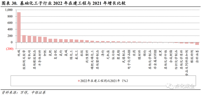 从行业数据来看,2022年,在35个子行业中,有7个子行业的在建工程同比下降,其余子行业在建工程均呈上升趋势。2022年在建工程同比增长超过100%的子行业为纯碱、胶黏剂及胶带、有机硅、其他橡胶制品、半导体材料、钾肥、氮肥、复合肥。