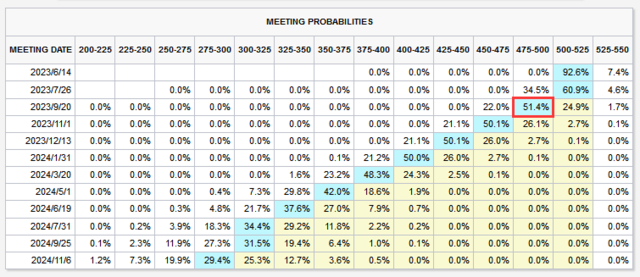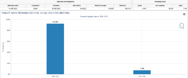 截至2023年5月11日,芝商所FedWatch工具显示美联储6月不加息概率为92.6%,9月开始降息概率为51.4%。另外,在美国4月通胀报告出炉后,被视为“美联储喉舌”、有“新美联储通讯社”之称的记者Nick Timiraos发文称,通胀数据将强化美联储暂停加息的计划。