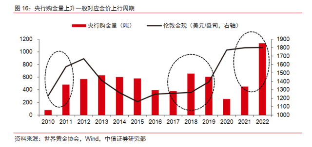 中信证券表示,央行购金可视作全球资管机构资产配置策略的映射,是金价上涨最有效的风向标之一。央行购金量上升往往对应金价上行周期。