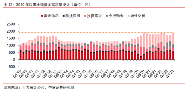 据世界黄金协会,2023年一季度全球央行购入黄金228.4吨,同比增长176.2%,维持高位。受央行购金以及场外交易的驱动,一季度全球黄金总需求量为1890.2吨,高位运行。