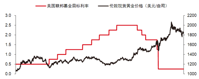 2015年12月至2018年12月,美联储加息阶段,伦敦现货黄金价格由1051.6美元/盎司升至1242.7美元/盎司,涨幅达到18.2%;2018年12月至2019年7月,美联储加息结束至降息开始阶段,伦敦现货黄金价格由1259.7美元/盎司升至1413.7美元/盎司,涨幅达到12.2%;2019年8月至2020年3月,美联储降息阶段,伦敦现货黄金价格持续上涨,并于2020年8月冲击2075.1美元/盎司的历史新高。