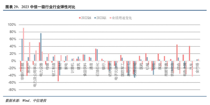 采用超预期因子作衡量当期宽基指数表现,指标显示主板超预期而中小市值板块低于预期。在2023Q1中业绩增速环比正增长的风格板块包括周期二、金融和成长,前二者的业绩增速环比增长在10%以上。2023Q1业绩增速环比增长前五的行业为非银行金融,房地产,电力及公用事业,电力设备及新能源,传媒,其业绩增速环比增长均在20%以上。