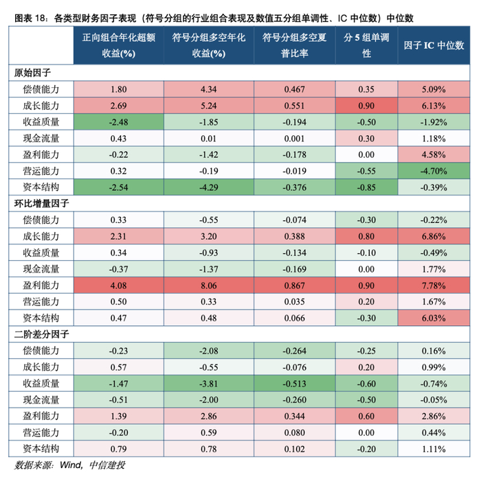 财务指标方面,基于正式财报信息构建行业财务指标,测试表明盈利和成长能力相关指标及其边际变化对行业的选择有参考意义。我们构造的复合财务因子,第一分组年化超额收益7.16%,夏普比率0.33。