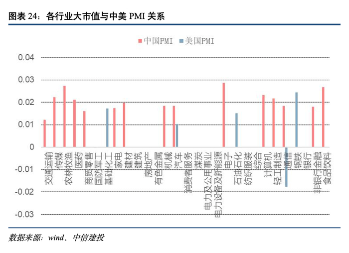 从中信一级各行业指数月度表现分析,2020年9月以来,以家电,地产为主的地产链以及以食品饮料为主的消费板块继续维持了与中国PMI的正相关关系,但以煤炭,有色为代表的上游周期行业则呈现与美国PMI的正相关。需正确面对本轮中国经济复苏的行业受益特征与历史的显著变化。
