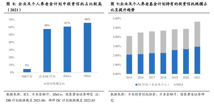 政府主导的养老金体系压制了公募投资信托的发展,日本ETF以外的公募投信增速较低。1)政府主导的养老金计划GPIF的资产主要委托第三方资产管理与信托,投资于国内外证券资产;2)企业与个人养老金计划中,企业DB计划中投资信托运用较少。企业DC计划、个人DC计划(iDeCo)及NISA账户中投资信托的应用均达到60%左右,且三者持有的投资信托占信托资产比呈提升趋势;3)日本养老基金体系中GPIF占比达到61%,企业DC计划、个人DC计划(iDeCo)以及NISA账户资产占比合计只有9%。政府主导的养老金体系限制了公募投信的发展机会,2013年至今日本除ETF以外的公募投信年复合增速3%。