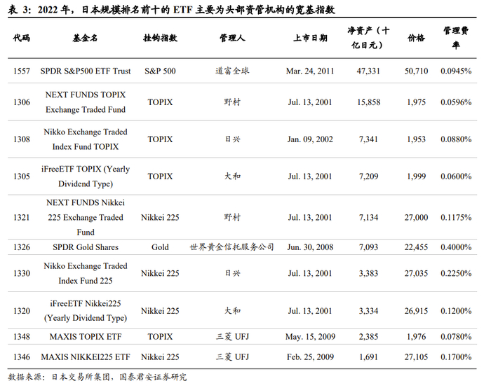 日本规模排名前十的ETF主要为头部资管机构的宽基指数,凭借先发优势和当地的投资者基础,在规模和流动性方面更能满足央行和机构投资者需求。1)日本规模最大的十只ETF中八只为头部基金公司发行的宽基指数。野村、日兴及大和均为2001年在日本发行ETF产品的公司。作为拥有大型ETF的本地供应商,受益于先发优势和本地投资者基础,其产品规模和流动性更大,更能够满足机构投资者及央行购买ETF的需求;2)在政策主导的市场环境下,头部资管公司凭借其集团公司在证券市场的地位,获得了优先发行ETF的机会。野村资管是最早于1995年发行ETF的公司,时值大阪证券交易所为振兴股市,联系野村证券着手发行日经300 ETF。
