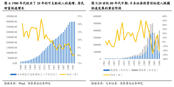 1980年代初期,居民财富快速增长,低利率环境中证券投资信托吸引力增强。经历了20年可支配收入的高速增长,1980年代个人的金融资产快速膨胀,产生了财富保值增长的需求。与此同时,低利率使银行存款失去了吸引力,资金开始流向证券市场。不具备直接从事股票投资经验,而又希望在低风险条件下参与股票市场,从而享受成长利益的投资者群体急剧扩大。因此,证券投资信托所具有的特点正迎合了时代的潮流和社会的需求,引起了投资者的极大关注。80年代中期,证券公司和证券投资信托已完全被一般投资者所接受,进入了规模快速发展的黄金阶段。