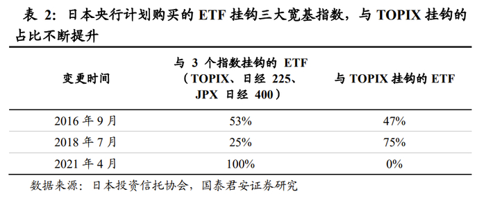 近年来,日本央行的ETF购买计划是ETF规模增长的主要动力,所持ETF挂钩三大宽基指数,与TOPIX指数挂钩的ETF占比持续提升。1)2022年底日本银行持有ETF 36.98万亿日元,占国内ETF总规模的62.50%;2)央行购买的ETF为挂钩TOPIX、日经225、JPX日经400的宽基指数,最初不同ETF的购买比例主要根据“央行持有份额占 ETF 份额的比例相当”原则,导致覆盖面较小的日经 225 指数的成分股投资比例较高,2016年以来加入对 ETF 市值和覆盖面的考量,TOPIX 指数投资比例持续提升。