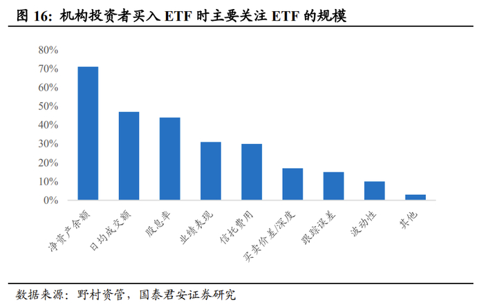 日本央行大量持有的宽基ETF倾向于被更多机构投资者购买,机构投资者购买ETF时更多考虑ETF的规模。央行大量持有的宽基ETF会面临退出的问题,需要考虑到机构投资者对ETF的需求。根据野村资管的调查,机构投资者中71%在选择ETF时会考虑ETF的规模,47%的投资者称其会考虑日均成交额,即流动性也是机构投资者关注的重点。