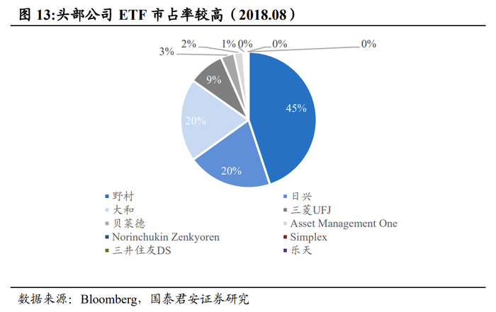 头部公司凭借集团公司的本土地位,宽基ETF产品先发优势明显。1)头部基金公司通过提供ETF产品维持领先优势。排名前三的资管公司野村、大和以及日兴ETF产品的市占率均高于其在国内公募信托市场的市占率,凭借更高的ETF占比,实现规模高增;2)头部公司宽基指数具备先发优势,更能够满足央行ETF购买计划的需求。央行大量持有的宽基ETF倾向于被更多机构投资者购买,机构投资者购买ETF时更多考虑ETF的规模。在政策主导的市场环境下,头部资管公司凭借其集团公司在证券市场的地位,获得了优先发行ETF的机会,凭借先发优势形成竞争力。