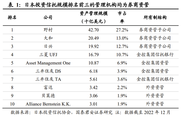 在日本,头部的公募投资信托管理机构主要为券商系1)日本以具有流动性的有价证券为投资对象的信托通常为契约型,由日本投资信托委托公司作为委托人负责投资决策,以信托公司或经营信托业务的银行为受托人执行。《证券投资信托法》要求投资信托委托公司的注册资本在5000 万日元以上或净资产额达到 5000万日元以上,并拥有执行投资运作业务的充足人员组成(董事及员工、组织体制等)。2)2022年底日本投资信托规模排名前三的委托公司均为券商资管,前十名以券商资管、金融控股集团的子公司和外资的独立资管公司为主。