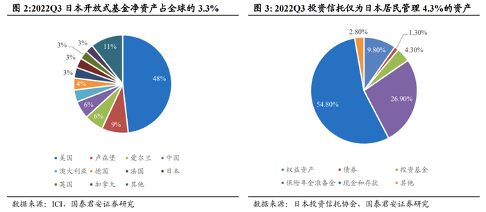 日本的证券投资信托是在为产业发展筹措资本的政策要求下产生的,目前在全球开放式基金和日本居民金融资产中占比较低。1)日本证券投资信托是为稳定证券市场而成立。1937 年7 月成立的“藤本有价证券投资组合”是最早的证券投资信托雏形;以“投资信托”的名义正式建立则在1941年11月。时值第二次世界大战期间,受日趋紧张的国际形势影响,东证股票行情急剧下跌。为了稳定股票市场,证券业界决定尽快建立投资信托制度。建立之初,证券业界向政府管理当局列举了四条理由:一是吸收大众的零散资金转向直接投资;二是吸收社会购买力,促进国民储蓄以抑制通货膨胀;三是实行证券民主化;四是增强社会上对债券和股票的消化能力,以稳定市场,提高证券投资安全。2)截至2022年9月底,日本开放式基金净资产仅占全球基金净资产的3.3%,为日本居民管理着4.3%的金融资产,远不及美国的12.6%和欧洲的10.4%。