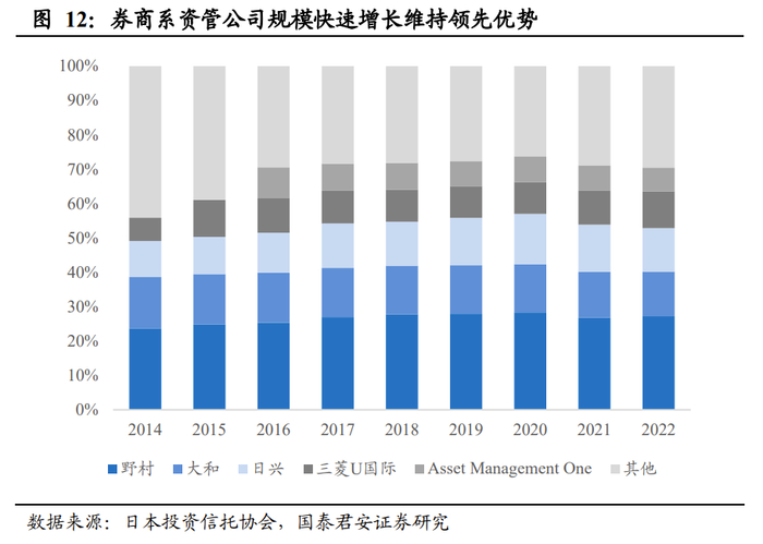 券商系资管公司规模快速增长维持领先优势。从管理规模来看,2022年野村资管、大和资管和日兴资管三家券商系资管公司分别管理着22、14、10万亿日元的资产,资管规模维持领先优势。从增速来看,凭借更高的ETF产品占比,野村、日兴的增速更快。