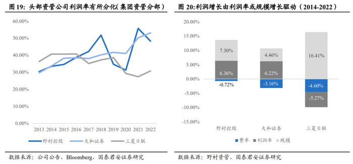 规模效应有效压降管理成本,提升盈利水平;其中,大型头部公司利润率提升驱动盈利水平提升;次头部公司降费引流,扩大规模,驱动盈利提升。1)野村资管等大型头部公司在行业中处于绝对龙头地位,具有明显的规模经济效应,且其竞争优势主要来源于先发优势形成的规模优势,费率并未大幅压降,更具利润空间。野村、大和资管的利润率呈提升趋势,对营业利润的增长具有显著贡献;2)次头部公司如三菱UFJ则采用了压降费率引流的策略,其相同品种的ETF产品费率较日兴更低。利润率呈下降趋势,利润水平的增长主要由规模增长驱动。
