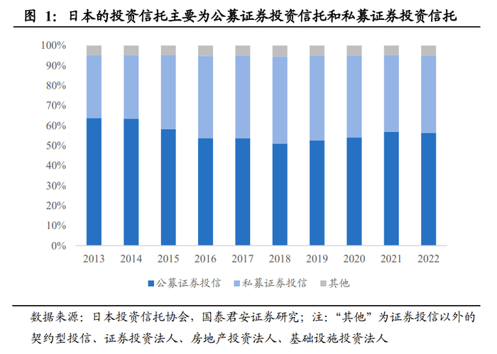 日本的公募投资信托是指以多数人(50 人以上)为发行对象的证券投资信托。1)根据日本的《证券投资信托法》,证券投资信托是指主要目的在于投资有价证券(针对超过投资信托财产总额1/2的金额)的投资信托。2)从法律形式上看,投资信托可设立为信托型或公司型。不论公募或私募,以具有流动性的有价证券为投资对象的证券投资信托通常为契约型,不动产投资信托一般为公司型;3)证券投资信托根据投资对象的数量可划分为公募和私募。公募证券投资信托是指以多数人(50 人以上)为对象进行发行的证券投资信托,私募证券投资信托是指以少数人(不到 50 人)、合格投资者或特定对象发行的投资信托。日本的证券投资信托以公募投信为主,2022年底公募投资信托的净资产占日本投资信托净资产的56%。