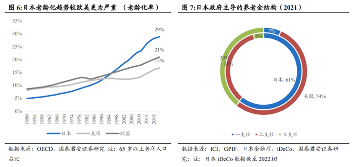 日本老龄化程度相较欧美更为严重,但其养老金体系主要由政府主导。1)1970年,日本老龄化率超过7%,步入老龄化国家行列,其老龄化提升趋势相较欧美更为严重。据65岁人口占比测算的老龄化率,2021年日本为29%,远高于欧洲的21%及美国的17%。2)为应对老龄化问题,日本构建了三支柱的养老金体系,然而财政补贴仍然是养老金的主要支撑,养老金体系由政府主导。一支柱方面,2001年日本正式建立“年金积立金”制度(Government Pension Investment Fund,GPIF),对投资体制进行重大改革,由厚生省直接委托开展市场化投资。2006年建立“新年金积立金”(新版GPIF),作为独立的投资机构,专司市场化投资业务。然而为满足养老金需求,2004年日本政府提高国库对国民年金给付的负担比例,政府补助三分之一;2012年将国民年金国库负担比例提高到50%;二支柱方面,2001年日本参照欧美企业年金制度设置了新的DB(Defined Benefit)计划;同年,日本借鉴美国401(k)计划,建立了企业型DC(Defined Contribution)计划;三支柱方面,IDeCo(Individual-type Defined Contribution)自2001年开始实施,是覆盖范围广泛的个人养老金计划;NISA(Nippon Individual Savings Account)自2014年开始实施,模仿了英国1999年设立的个人储蓄账户(ISA)机制,通过此种小额投资免税账户鼓励家庭充分利用现有的金融资产。