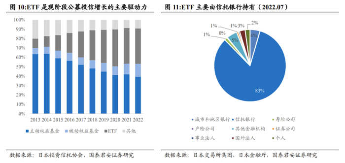 近10年日本公募投信行业的增长主要由ETF驱动,信托银行是ETF的主要持有人,执行央行购买ETF的指令,代央行持有ETF。1)2013-2022年,ETF规模增长贡献了公募投信总规模增长的67.5%。ETF主要由信托银行持有,以执行央行的ETF购买计划,代央行持有ETF。截至2022年7月,信托银行持有的ETF占ETF总规模的83%;2)日本央行的 ETF 购买计划始于2010年,作为当时的货币宽松计划 CME(Comprehensive Monetary Easing)的一部分,主要目的在于提升本土投资者的风险偏好,加大其所持有的股票占总金融资产的比重,降低权益资产的风险溢价,从而降低权益资本成本,以刺激企业进行主动投资。2013年,日本央行推出了QQE(Qualitative and Quantitative Ease),ETF购买被当作QQE的一部分政策举措,规模大幅提高,此后日本央行多次调高ETF购买规模。央行通过指定的信托银行购买ETF作为信托财产,避免对于央行集中持有ETF干扰ETF市场的指责,同时为信托银行带来管理费收入。