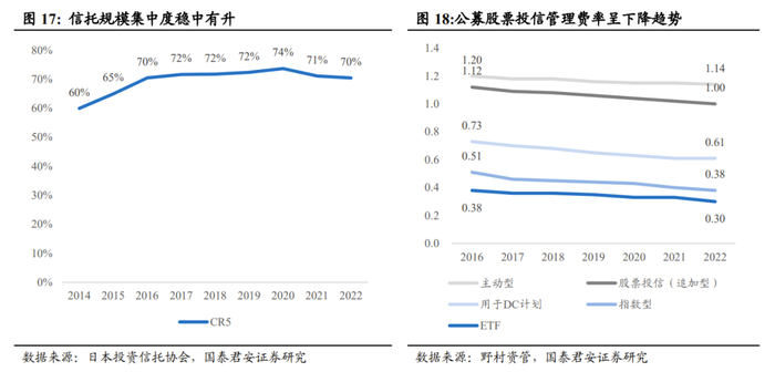 随着行业规模的增长和头部集中程度提升,基金费率略有下降。1)日本信托行业集中度高于美国和我国,行业集中度稳中有升。日本信托行业集中度较高,2022年末CR5达到70%,高于我国的21%以及美国2021年末的54%。2014年以来行业集中度呈稳中有升的趋势;2)随着基金规模的增长和集中度的提升,基金费率略有下降。头部公司基金规模快速提升,能够发挥规模优势效应,在固定成本、销售成本、交易效率等方面压降基金费率。