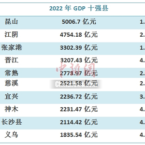 随着各地2022年国民经济和社会发展统计公报发布,2022年GDP十强县已经出炉,分别是昆山、江阴、张家港、晋江、常熟、慈溪、宜兴、神木、长沙县和义乌。