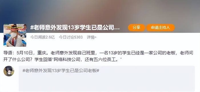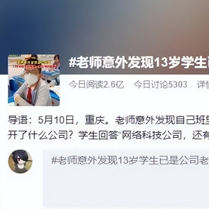 5月11日,根据水母网报道,重庆一名老师意外发现自己班里,一名13岁的学生已经是一家公司的老板,此事引发热议,随即相关话题登上各大平台热搜。