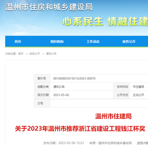 根据省建设厅《关于做好2023年度浙江省建设工程钱江杯奖(优质工程)考核推荐工作的通知》要求,2023年度温州市住建领域钱江杯奖(优质工程)推荐工作,经企业申报、专家组现场评价、评委会评审,拟推荐以下17个项目入选2023年度浙江省建设工程钱江杯奖(优质工程)推荐名单,现予以公示。公示期为2023年5月6日—5月15日,公示期间,广泛接受社会监督,听取意见和建议。