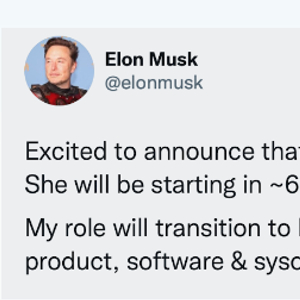 马斯克称已为推特聘任新CEO:约六周后上任,是一位“她”